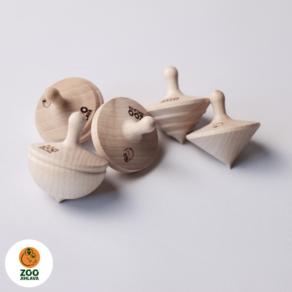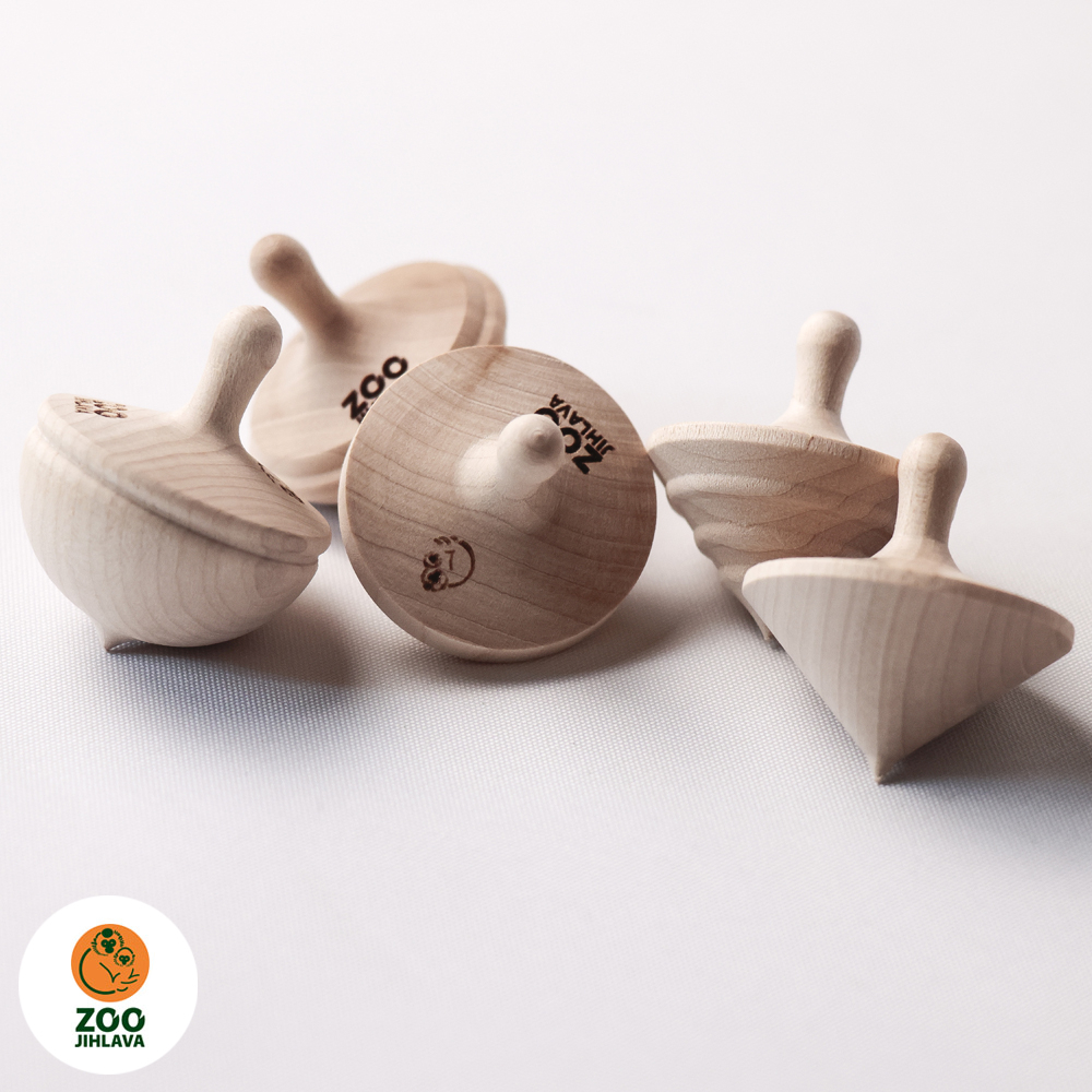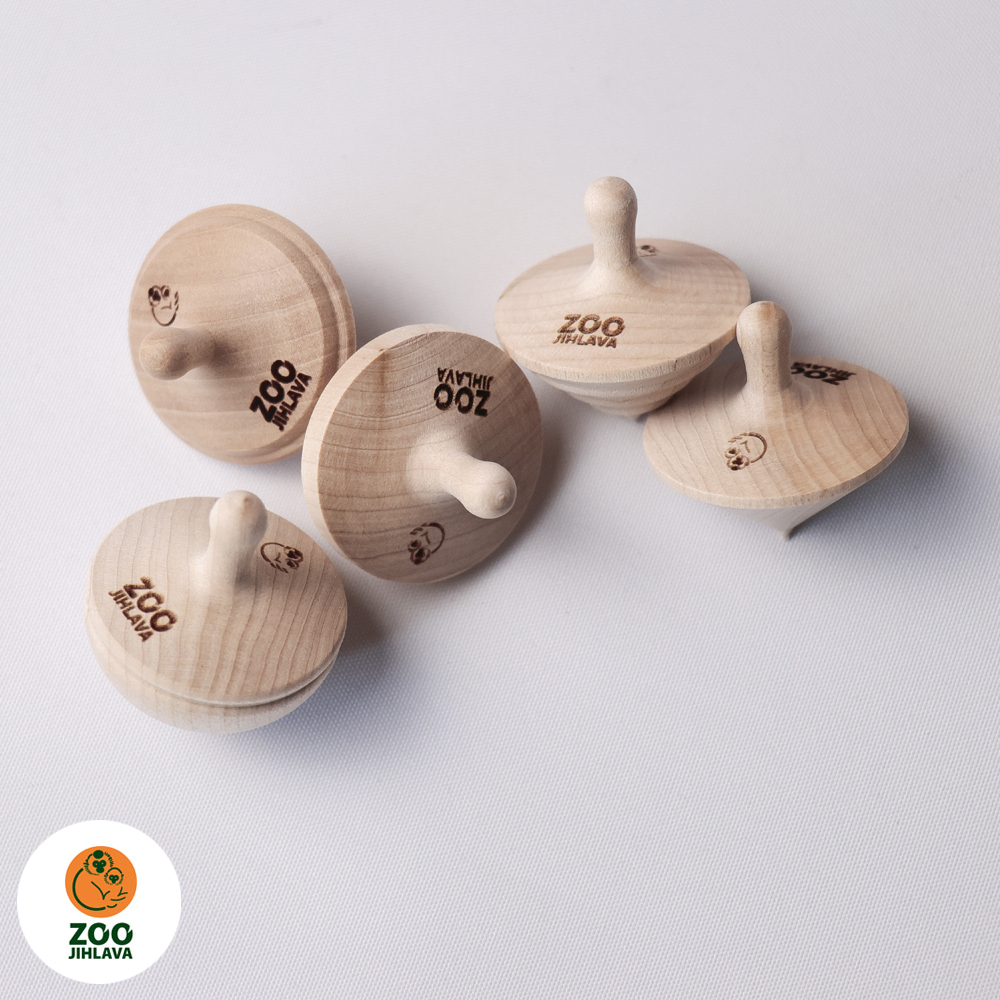 Dřevěná káča s gravírovaným logem Zoo Jihlava, různé tvary.