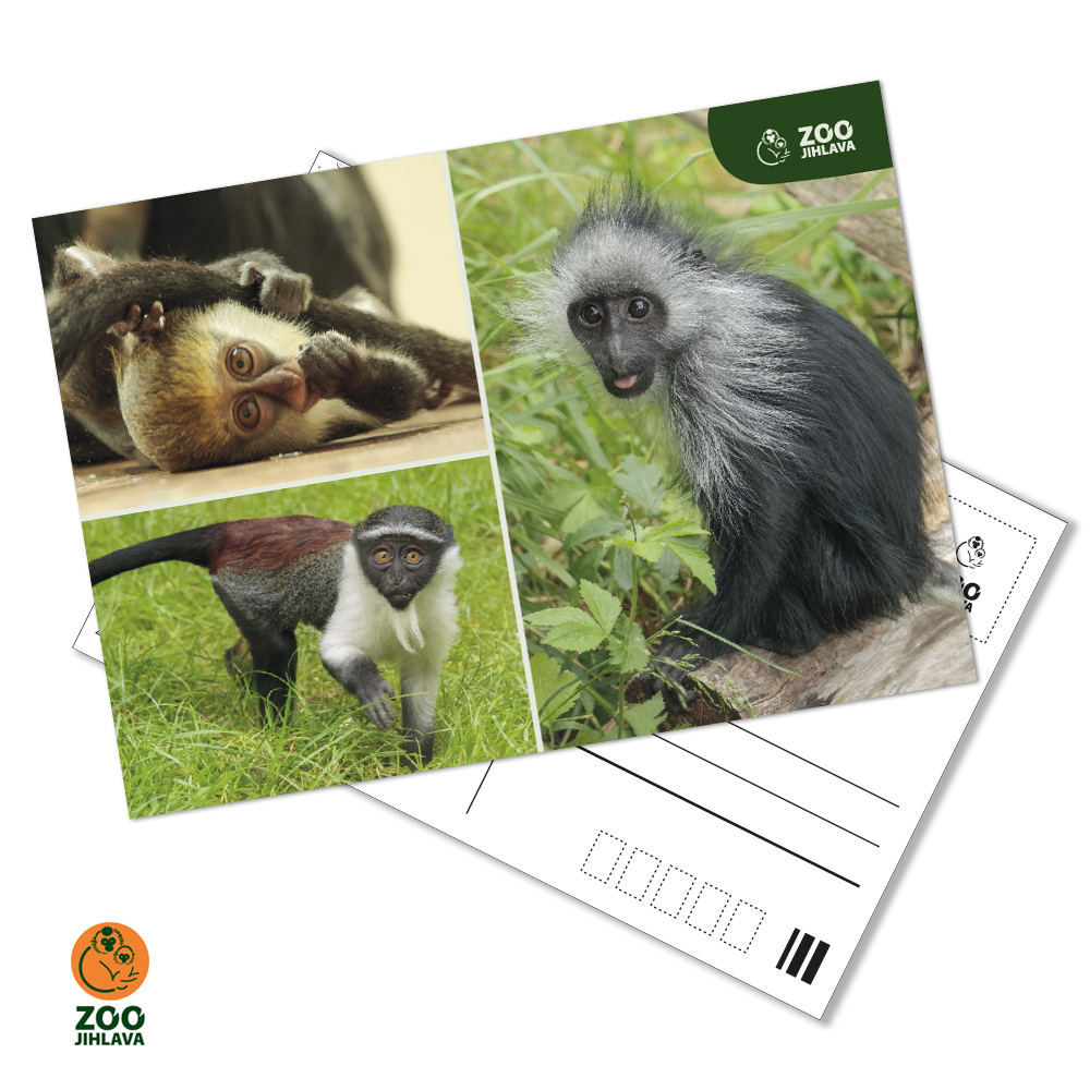 Potěšte své známé či příbuzné pozdravem z jihlavské zoo. Vlevo nahoře: kočkodan Loweův, vlevo dole: kočkodan Rolowayův, vpravo: gueréza běloramenná.
